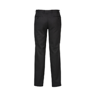 Flat front, straight through the leg. Waistband with stretch fusing. Internal security pocket on right front pocket, and two rear pockets.